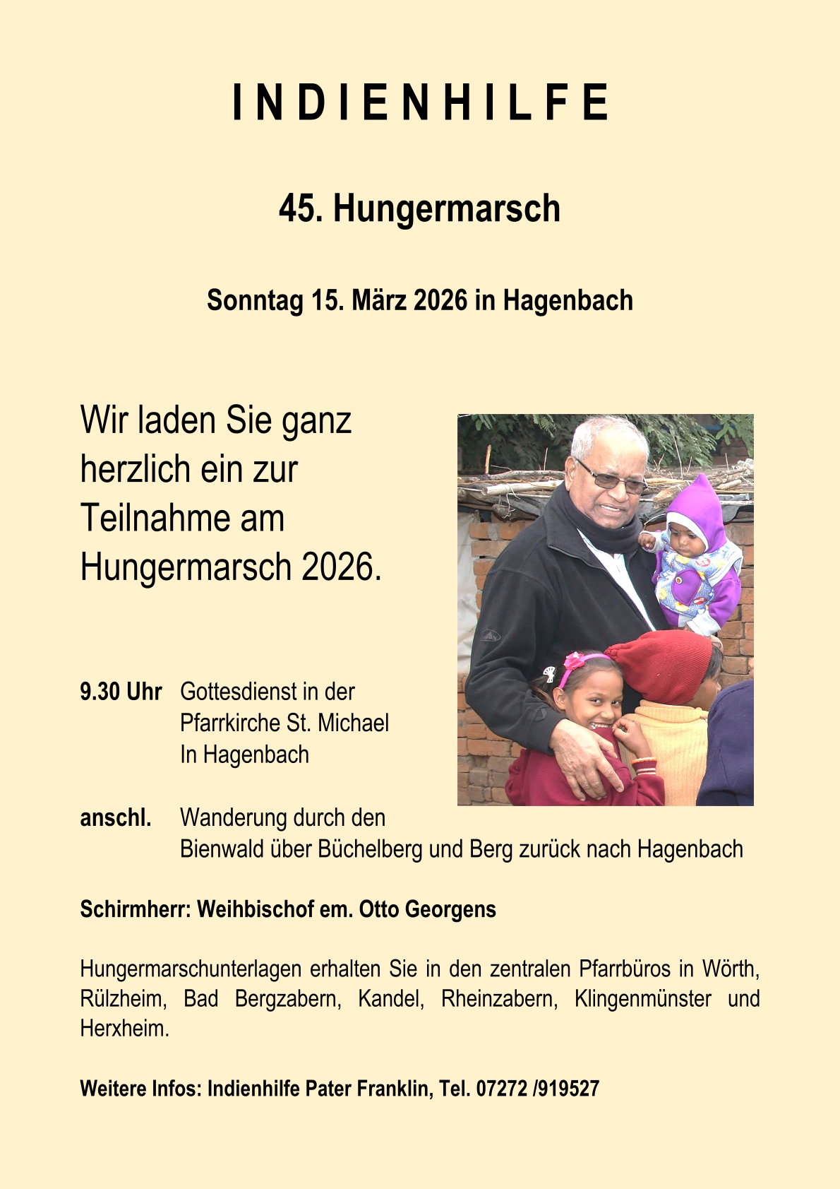 Der Hungermarsch der Indienhilfe hat bereits große Tradition. Er findet bereits seit 1981 jährlich im März statt und führt ca. 20 km quer durch den schönen Bienwald. Am Ausgangspunkt in Hagenbach wird der Tag traditionell mit einem ganz besonders gestalteten Gottesdienst begonnen. Für eine ansprechende musikalische Gestaltung mit modernen Rhythmen ist gesorgt. Im Anschluss machen sich die Teilnehmer auf den Weg. Für die Verpflegung der Marschierer ist bei den Stationen Büchelberg (Mittagessen) und Berg (Kaffee und Kuchen) gesorgt. Den Abschluss bildet wiederum Hagenbach, wo es nochmals Kaffee und Kuchen sowie ein indisches Spezialgericht gibt. Wie wird den Armen durch den Hungermarsch geholfen? Bei jedem Teilnehmer können sich vor dem Hungermarsch Freunde, Bekannte, Arbeitskollegen, usw. auf dessen Teilnehmerkarte mit einem Spendenbeitrag (eine Art Kilometergeld) eintragen. Nach dem Hungermarsch überweist der Teilnehmer dann die eingesammelten Beträge auf eines unserer Spendenkonten.